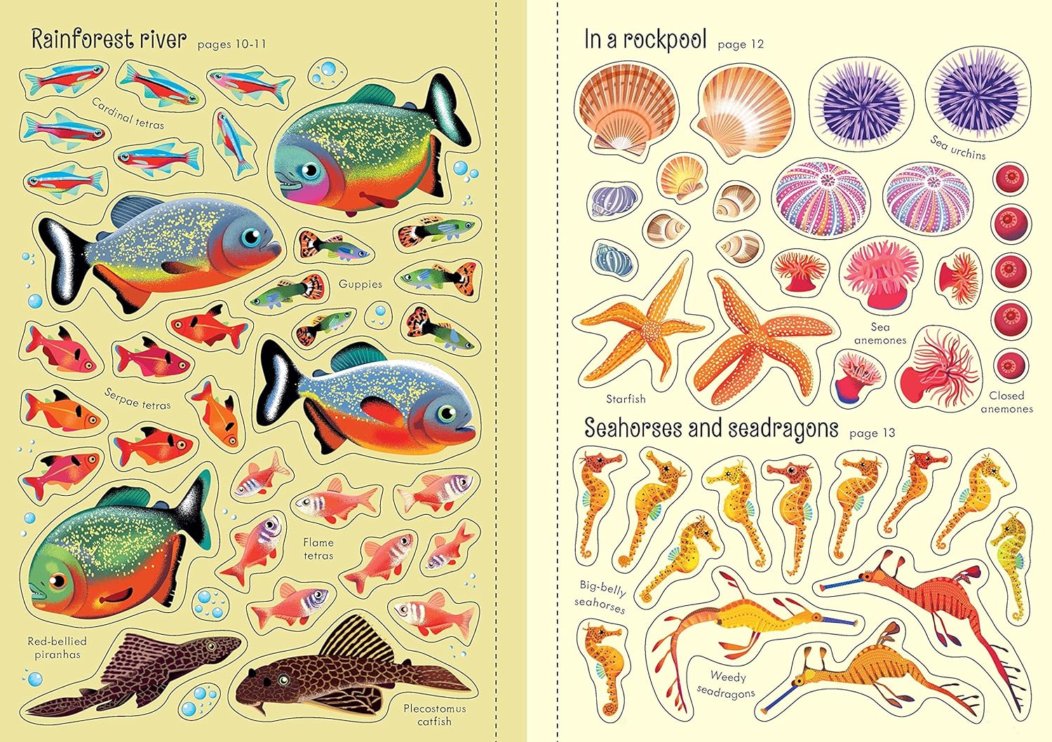 Dive into a shark tank, marvel at a coral reef and visit the penguin pool in this underwater-themed sticker book. There are over 240 reusable stickers of fish, turtles, seahorses and other sea creatures, and a fold-out back cover to store stickers when not in use.